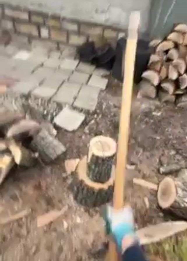 person splitting wood outside a house. The ground is dirt and grass with scattered wood pieces and an axe. The house has a grey exterior and a small pile of firewood is stacked beside it. There are also some tires stacked up. The person walks through the area, showing the cut wood and the axe.