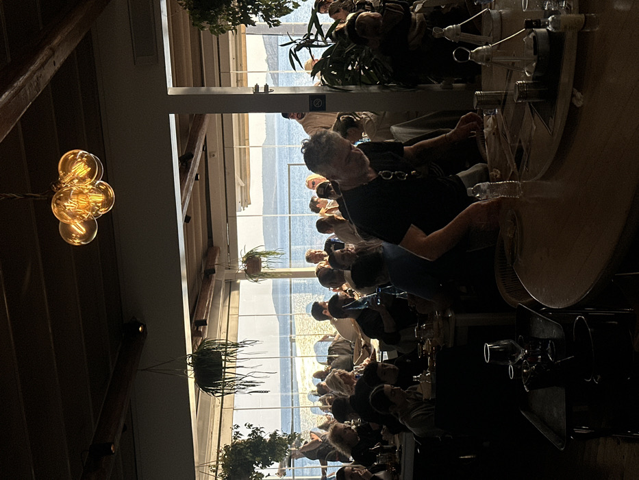 The image depicts the interior of a waterfront restaurant located in the Vouliagmeni Municipal Unit, Greece, during what appears to be late afternoon or early evening. The scene is filled with numerous patrons, with strong backlighting from large windows overlooking a sunlit body of water, possibly a bay, with distant landmasses visible on the horizon. In the foreground, an adult male with gray hair and a beard, wearing a dark short-sleeved shirt and eyeglasses on a lanyard, stands leaning over a round wooden table. A plastic water bottle is present on the table near him, along with various condiment shakers and what appear to be menus or placemats. To the lower left, a dark service cart with a metal tray, wine glasses, and bottles is partially visible in deep shadow. Throughout the midground and background, multiple individuals are seated at tables, engaging in dining and conversation. Most figures are partially silhouetted due to the light source from the windows. The restaurant features a dark ceiling with exposed wooden beams, from which several potted plants with long trailing foliage are suspended. A prominent light fixture, composed of a cluster of five amber-toned, exposed filament bulbs, hangs from the ceiling in the upper center. Structural columns are visible, supporting the roof and framing the expansive window views of the sparkling water.