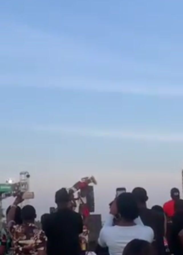 From a low-angle, the scene captures a live performance viewed by a diverse crowd. People stand and sit in front of a stage with speakers. A performer, attired in a red and white outfit, balances atop another person's shoulders on stage. Many in the audience are holding their phones up, recording the act. The sky overhead is pale blue. In the background, there is a building and event infrastructure, including a green and white branded platform.