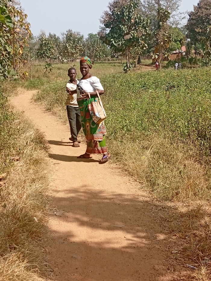 The image displays an outdoor scene on an unpaved dirt path in Unguwar Gaya, Nigeria. In the foreground, an adult female and a male child stand on the reddish-brown path. The woman, positioned closer and slightly to the right of the frame, has dark skin and wears a white short-sleeved top, a vibrant green-dominant patterned long skirt, and a multi-colored headwrap. She carries a light-colored fabric tote bag with a design on her left shoulder and holds a small, dark object in her right hand. She wears dark sandals. Behind her and slightly to the left, the male child, also with dark skin, wears a light-colored short-sleeved shirt, dark trousers, and dark sandals. Both individuals face generally towards the camera. The dirt path curves gently to the left and is flanked by dense green foliage and drier, lighter-colored grass. The midground and background feature numerous medium-sized trees with green leaves, forming a sparsely wooded area. In the far background, to the right, a small, reddish-brown structure, possibly a hut, is partially visible among the trees, with several indistinct human figures nearby. The sky is clear and light, indicating bright daylight, and shadows are cast upon the path.