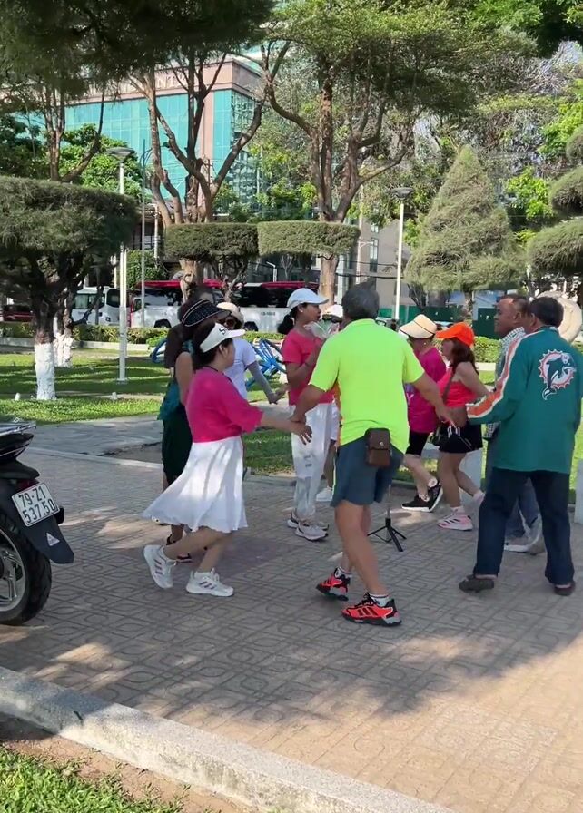In a wide shot, a group of about ten people of various ages and genders are dancing in a circle on a tiled, paved area in a park. The dancers are holding hands and moving in a circular motion. They are dressed in casual clothing. One woman is wearing a pink top and a white skirt. A man is wearing a bright yellow shirt and shorts. A motorcycle is parked to the left. Trees and greenery surround the paved area. In the background, a modern building is visible, as well as lawn areas and various shapes of hedges. The sky is clear and the sun is shining. A loudspeaker attached to a stand is playing music for the dancers.