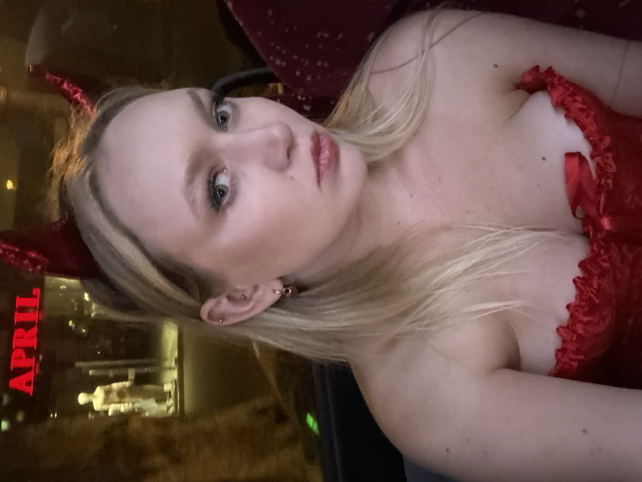 A blonde female is depicted in a close-up, chest-up portrait shot, likely taken indoors or within a vehicle at night