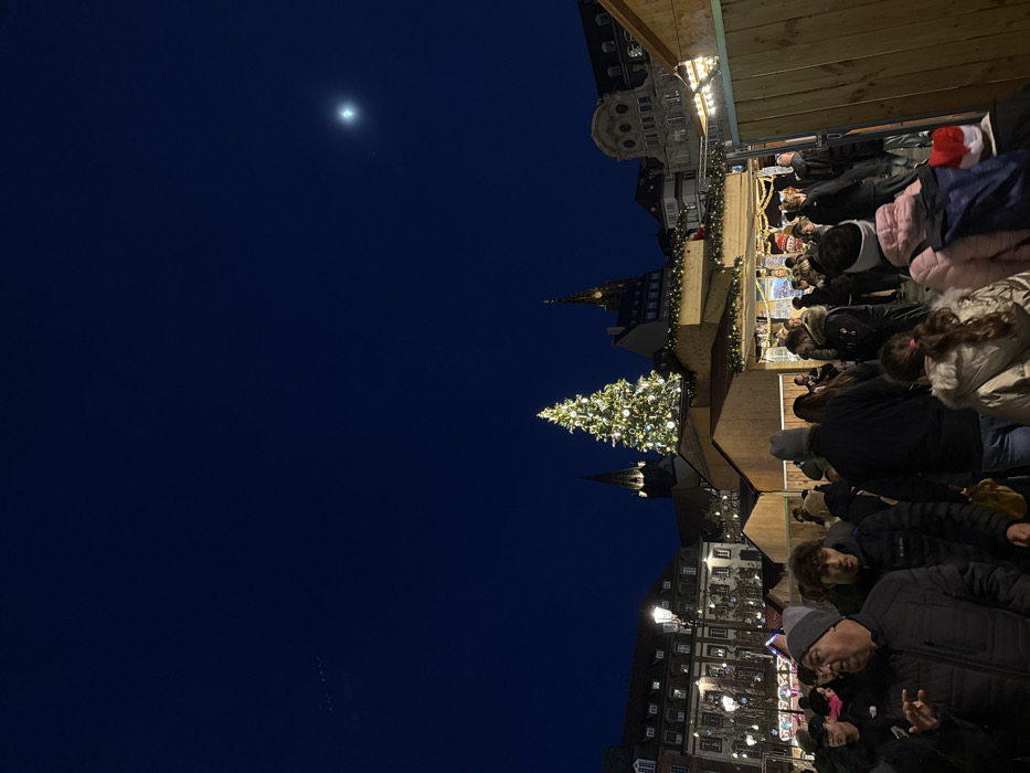 This image depicts a crowded Christmas market scene at night in Place Kléber, Strasbourg, France. The upper two-thirds of the frame show a dark navy blue night sky with a distinct, bright, and nearly full moon visible in the upper right quadrant. Faint, scattered lights or stars are discernable in the upper left. In the mid-ground, a large, conical Christmas tree, densely decorated with warm white lights and spherical ornaments, stands prominently, illuminated against the dark backdrop. Behind the tree, the illuminated upper spire of Église protestante Saint-Pierre-le-Jeune is visible to the left, and a taller, darker spire of Strasbourg Cathedral is partially visible to the right. Various multi-story historic buildings with illuminated windows and traditional pitched roofs form the background on the left, while a grander, ornate building with rounded windows is visible on the far right. A classic streetlamp with a globe light is positioned in the mid-left. The lower half and foreground are filled with a dense crowd of people moving through the market. Numerous wooden market stalls with pitched roofs are visible, some adorned with string lights and garlands, indicating a festive atmosphere. A large wooden stall in the immediate right foreground consists of vertical light-colored planks. Individuals in the crowd are dressed in winter jackets, coats, and hats. In the left foreground, a man wearing a grey beanie and dark jacket is seen facing slightly left, appearing to speak with his mouth open and left hand raised. To his right and slightly behind him, a younger man with dark curly hair and a dark jacket looks forward. Further into the crowd, the backs of individuals in varied winter attire are visible, including one wearing a red Santa hat in the far right foreground. The crowd exhibits general movement and congregation within the market area.