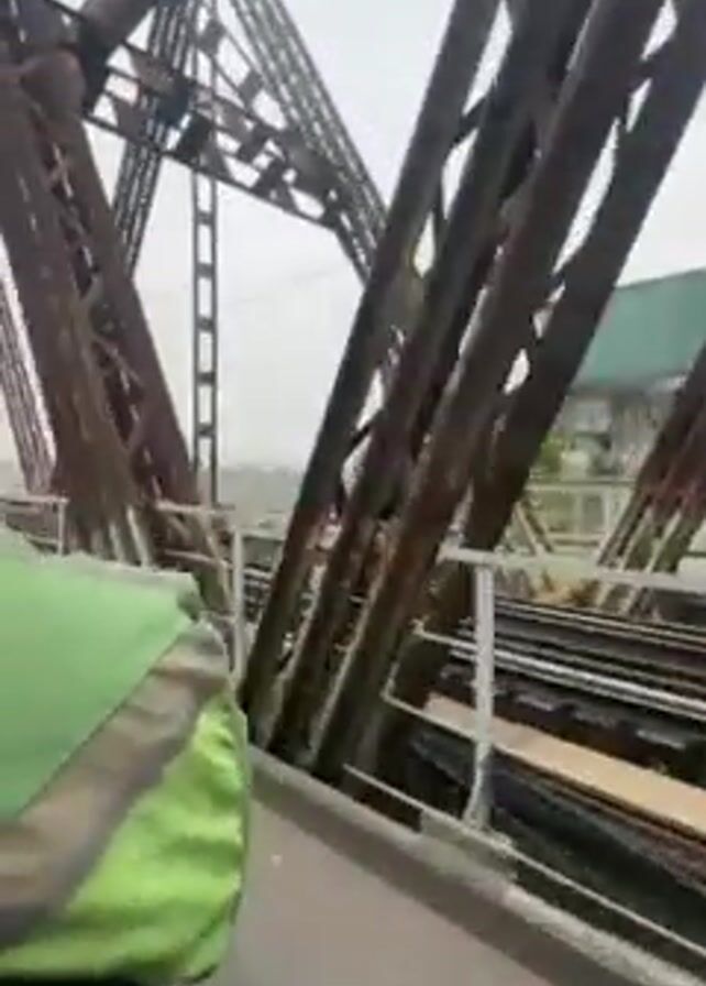 The camera, seemingly mounted on a vehicle, travels across a metal bridge