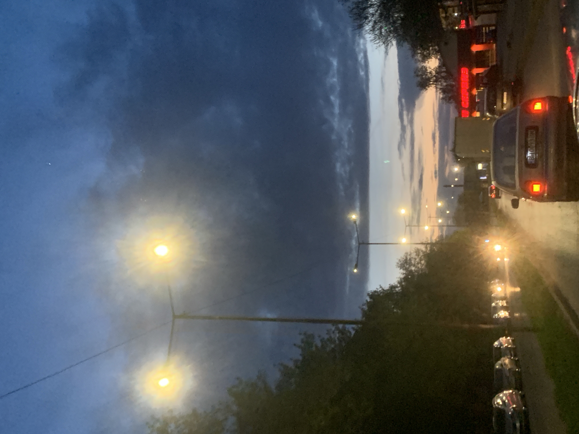 The image captures a street scene in Vidin, Bulgaria, at dusk or night. The view is oriented vertically, showcasing the sky with dark, heavy clouds on the left, transitioning to a lighter, possibly sunset-tinged area on the right. Streetlights illuminate the scene, their bright glows dominating the lower left and continuing along the right side of the frame. A line of trees borders the right side of the road, interspersed with parked cars. On the far right, cars drive along a street, indicated by their tail lights. In the upper right, a building with brightly lit signage, potentially a restaurant, is visible. The general atmosphere suggests rainy or wet conditions.