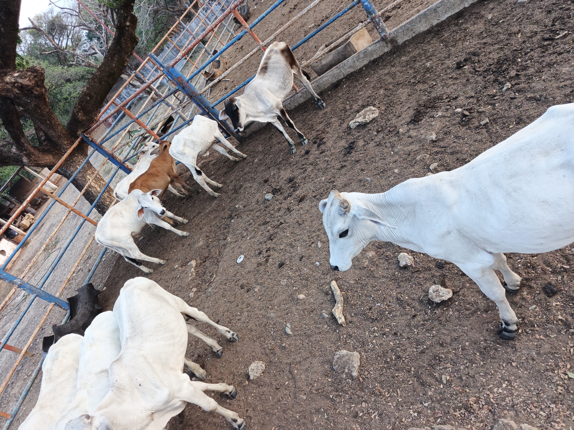 The image depicts a cattle pen in Las Tejas, Venezuela. Several cattle, predominantly white with some brown and grey markings, are present inside the pen which is fenced with blue and orange metal bars. The ground is dirt. A tree grows along one side of the pen.