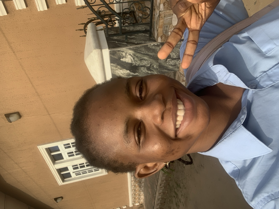 A smiling person makes a peace sign. The individual has smooth skin, dark hair, and white teeth. They wear a light blue collared shirt with a tan strap across the chest. Behind the person, a building has tan siding with a white-framed window. A marble pillar with decorative ironwork is visible on the right. The scene is well-lit with natural sunlight.