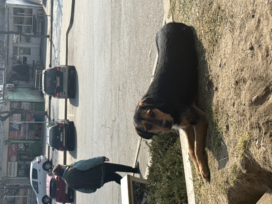 The image displays an outdoor scene in Simitli, Bulgaria. In the immediate foreground, a mixed-breed dog is lying on its belly on a patch of dirt and sparse grass, facing forward towards the viewer. The dog has a predominantly black body, tan-brown fur on its legs, head, and muzzle, and a small white patch on its chest. Its front paws are extended. Behind the dog, in the midground, a paved area, identifiable as a street or parking lot, runs horizontally across the frame. A person is observed walking from left to right across this paved area, with their back mostly turned to the camera. The person is wearing a dark vest over a light blue long-sleeved garment and dark trousers. Several vehicles are parked on the paved surface in the background. From left to right, these include a white SUV or hatchback, a red hatchback, a dark-colored sedan or wagon, and a dark SUV equipped with a roof rack. A white curb separates the grassy foreground from the paved area. In the far background, commercial buildings line the street. One building on the left features a section with a light green/teal facade and multiple display windows with visible signage. To its right, another building, light in color, has a covered outdoor seating area with tables and benches. Bare trees and utility poles are also visible along the street. The scene is illuminated by strong daylight, casting defined shadows.