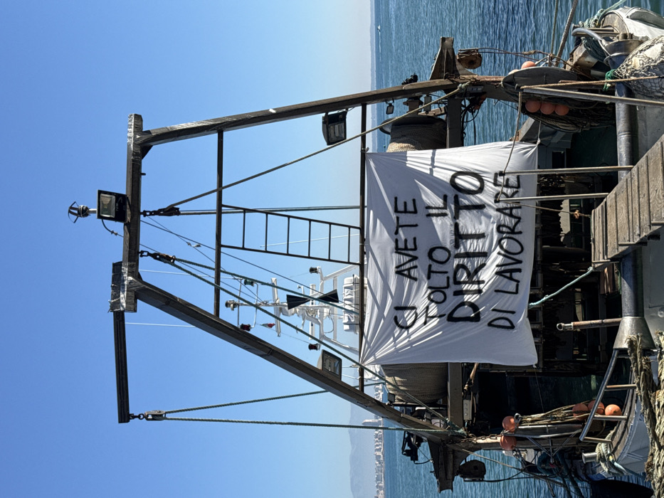 The image displays the stern of a fishing vessel, likely a trawler, docked or anchored in the harbor of Anzio, Italy, under a clear blue sky. A large white fabric banner with hand-painted black capital letters is prominently displayed across the stern structure. The banner reads: "CI AVETE TOLTO IL DIRITTO DI LAVORARE" (You have taken away our right to work). The vessel features a robust, dark-colored metal gantry or A-frame structure at its stern, equipped with various ropes, pulleys, and a forward-facing spotlight. A ladder is affixed to the right side of this gantry. Behind the banner and the gantry, the mast and antenna array of another larger white vessel are visible. The boat's stern deck shows a wooden plank walkway, ropes, and orange spherical buoys attached to the hull. A large, spooled winch or reel is partially visible behind the banner, centered on the boat. The calm blue-green sea extends into the background, where a distant coastline with a city skyline and hills is visible on the left, consistent with Anzio's geographical features. On the far right, a small white boat creates a faint wake on the water. No individuals are visible in the scene. The overall lighting suggests daylight conditions.
