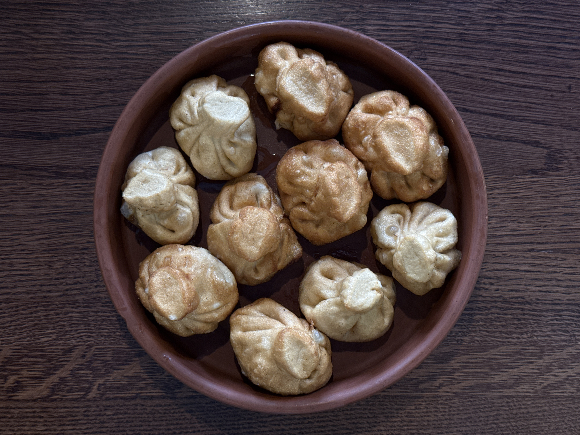 A top-down shot depicts a brown clay plate filled with approximately ten beige and light brown dumplings