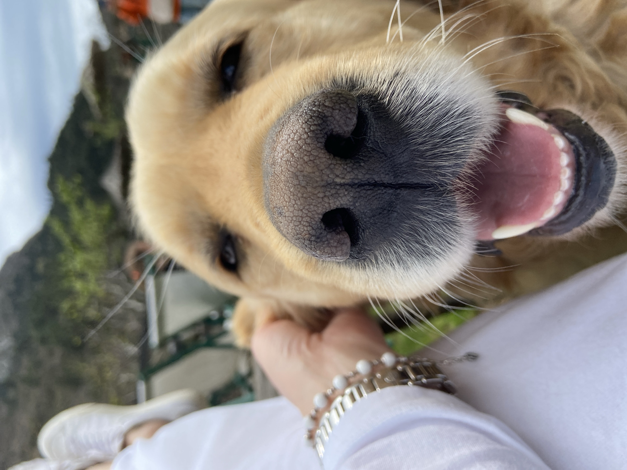 A close-up, slightly tilted photograph shows the head and face of a golden retriever, with a portion of a person visible at the bottom of the frame. The dog's face is the primary focus, showcasing its nose, eyes, mouth, and whiskers. The dog's mouth is slightly open, revealing its tongue and teeth. A person's hand is visible holding the dog's face, with a watch and bracelets on the wrist. The person is wearing a white shirt and white shoes. The background appears to be a landscape with trees. Location information cannot be verified from the image.