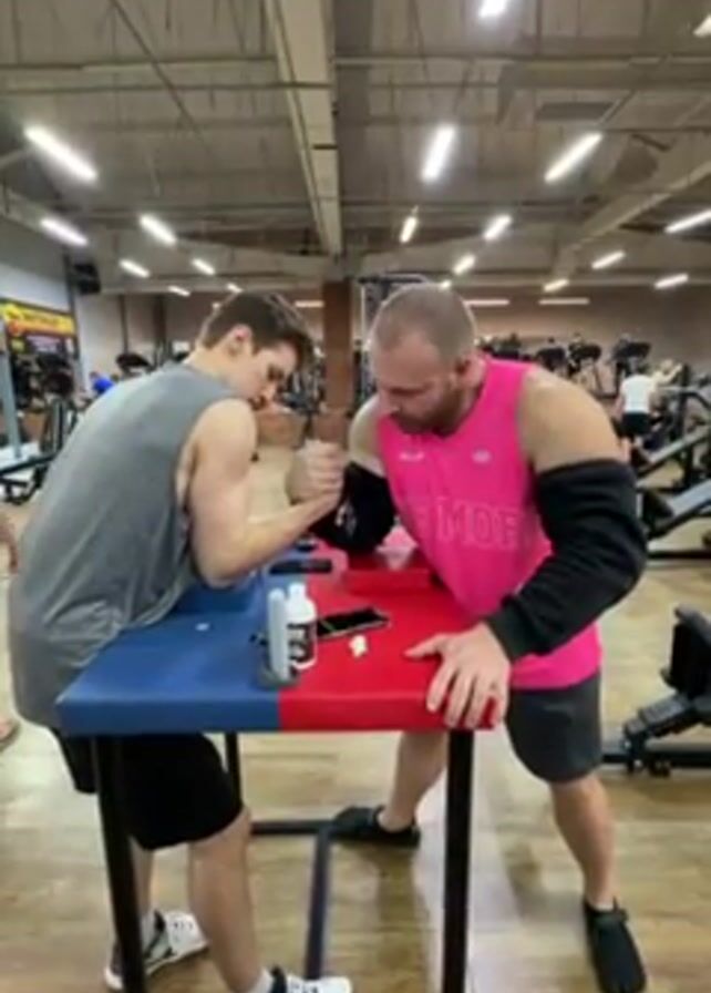 Two men are arm wrestling at a table in a gym