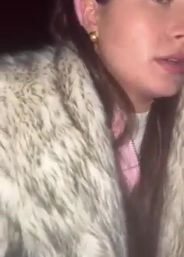 A person wearing a grey and white fur coat and a pink headband opens a car door, gets in, and sits down. The person has light skin, dark hair, and is wearing gold earrings. The car's interior is dark, with a red seat visible in the background. The environment appears to be nighttime.