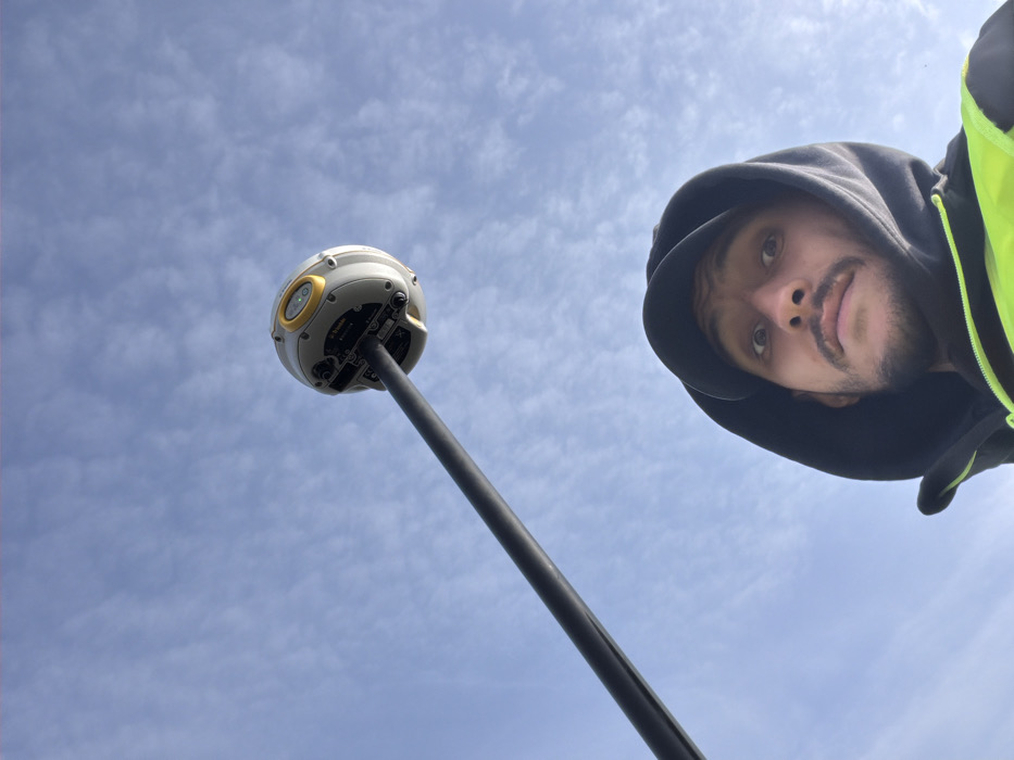 - "An upward-angle shot captures a male individual holding a surveying pole topped with a Trimble GPS/GNSS receiver against a bright blue sky with sparse white clouds" by FM-Yk7Fx2, licensed under CC BY 4.0