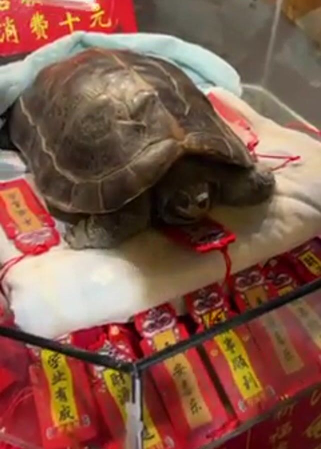 A video shows a large turtle, likely in an enclosed space, possibly a display case. The turtle rests on a white cushion. A light blue cloth covers part of the turtle's shell. Around the cushion are numerous small, red, rectangular charms, each with writing and a decorative image, possibly lions. A sign in the foreground states in English, "Blessing Living Turtle." Part of the sign is in Chinese. The camera zooms in closer to the turtle's head, showing it nestled against one of the charms.