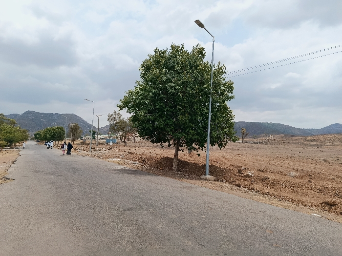 The image depicts an outdoor scene in Rafin Pa, Nigeria, under an overcast sky. A gray asphalt road extends from the foreground into the distance, with visible surface wear. On the left side of the road, a group of approximately five to seven individuals is walking away from the camera. One person in this group wears dark attire with a head covering; others wear lighter clothing. On the right side of the road, a tall, metallic street lamp with a solar panel fixture stands next to a large tree featuring dense green foliage. The ground immediately to the right of the road consists of dry, reddish-brown earth with scattered small rocks and sparse, dry vegetation, extending into an open, undeveloped field. In the mid-distance on the left, additional street lamps and smaller trees line the road. The background features a range of arid, rocky hills or mountains extending across the horizon. Horizontal lines, consistent with utility wires, are visible in the upper right quadrant of the frame. Distant, indistinct structures are partially visible near the base of the hills on the right.