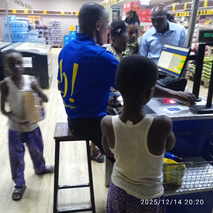 A supermarket scene presents two children wearing tanks and patterned pants. One child is carrying a box. A man in a blue shirt with a yellow logo sits at a cash register, serving a family. Another man watches from behind. A monitor displays yellow and blue graphics. A metal shopping basket is visible next to the register. The timestamp "2025/12/14 20:20" is imprinted at the bottom of the image. Shelves stocked with goods are visible in the background.