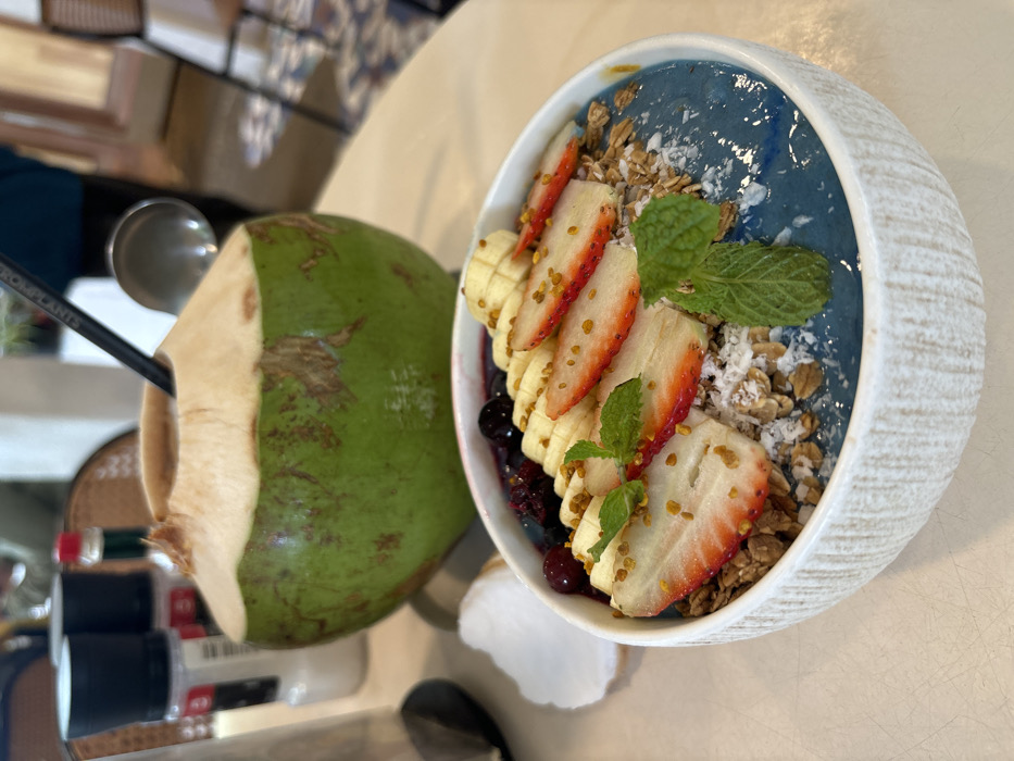 This image captures a breakfast or brunch setting on a light-colored table at a restaurant in Ban Ao Nang, Thailand. In the foreground, a white, textured ceramic bowl contains a blue smoothie bowl topped with a variety of fresh ingredients. These toppings include sliced strawberries, sliced bananas, whole blueberries, brown granola, shredded white coconut flakes, and a small sprig of green mint. Yellow bee pollen is sprinkled over the fruit slices. In the mid-ground, slightly to the left and behind the smoothie bowl, sits a whole green young coconut with its top partially husked, revealing a lighter cream-colored surface. A black straw, bearing the white text "FROM PLANTS," is inserted into the coconut. To the left of the smoothie bowl, a fragment of what appears to be a white coconut husk or decorative element rests on the table. In the blurred background, behind the coconut, two clear spice grinders with black caps are visible, along with a small bottle featuring a red cap and green label. Further back, a rattan or woven furniture piece and a patterned floor or rug are discernible, indicating an indoor or covered outdoor dining area. No individuals are visible in the frame.