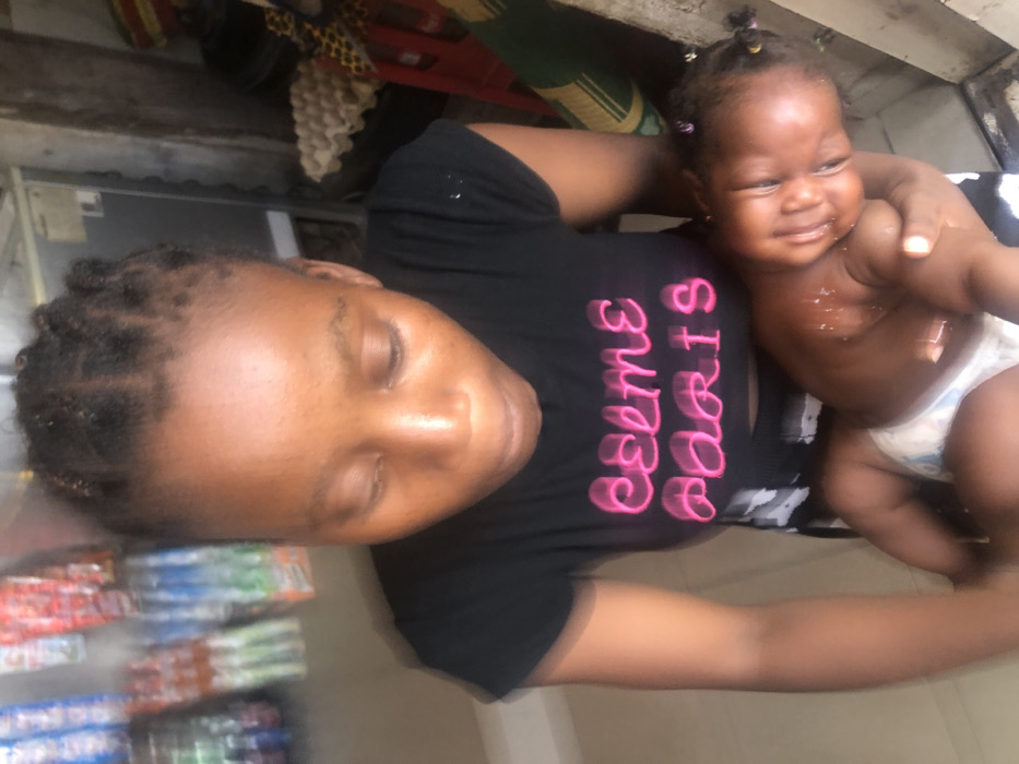 A woman wearing a black t-shirt with "ceme Paris" in pink holds a baby. The baby is bare-chested, wears a diaper, and smiles. The woman's eyes are closed, and her hair is braided. They are in what appears to be a shop with goods displayed on a shelf nearby. The photo has a slight blur.