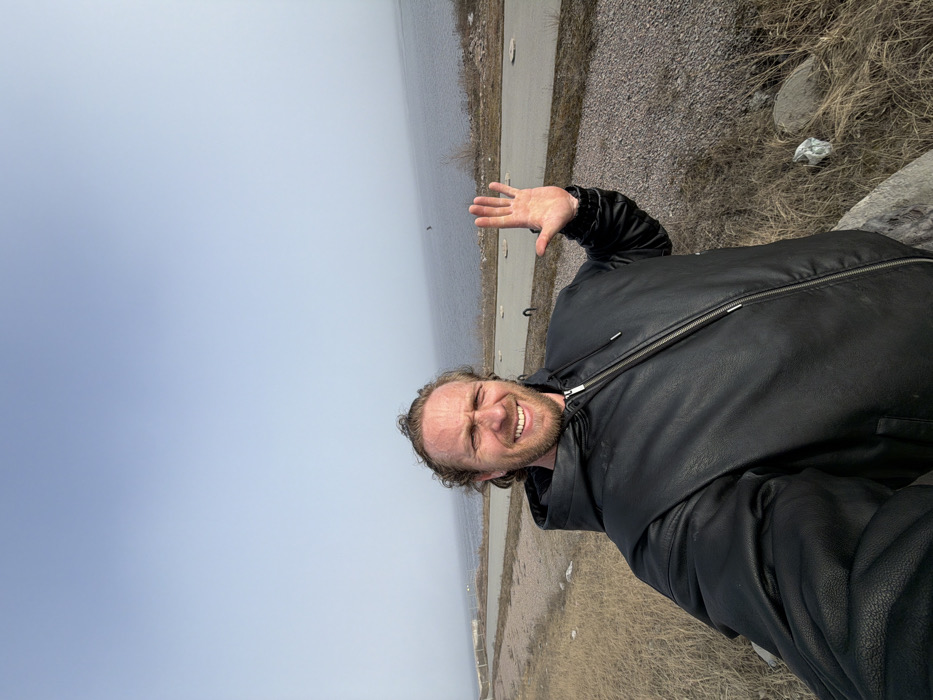 An adult male is prominently featured in a selfie photograph taken in Kronstadt, Russia. He has curly brown hair, a beard, and is wearing a black, hooded, zippered jacket. His face displays a wide, toothy smile, with forehead wrinkles indicating his expression. His left hand is raised, palm facing forward, in a clear gesture. The background consists of dry, light-colored grass and scattered rocks in the foreground, transitioning to a grey paved road or path running parallel to a large body of water. Along the edge of this path, several dark, curved, bollard-like structures are evenly spaced. The water body is a dark grey-blue, with minor ripples, and a faint, dark, vertical object is discernible in the distant water. The sky is a uniform, pale grey-blue, suggesting an overcast or hazy atmospheric condition.