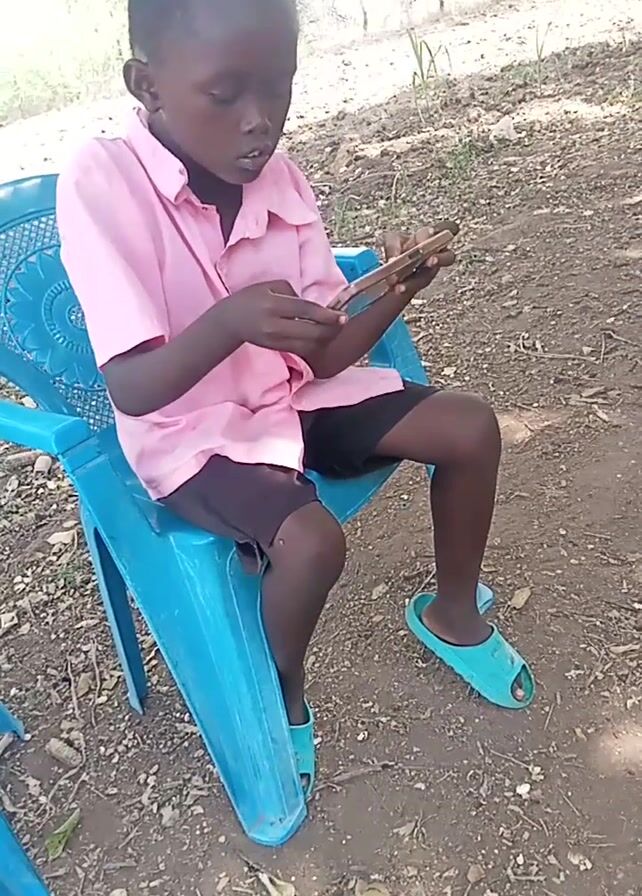 A young boy dressed in a pink shirt and black shorts is sitting on a light blue plastic chair. He is lying back with his legs outstretched, wearing light blue sandals. He is holding a cell phone in his hands and appears to be looking at it. The ground around him is covered with dirt and leaves. The scene is outdoors, possibly in a yard.