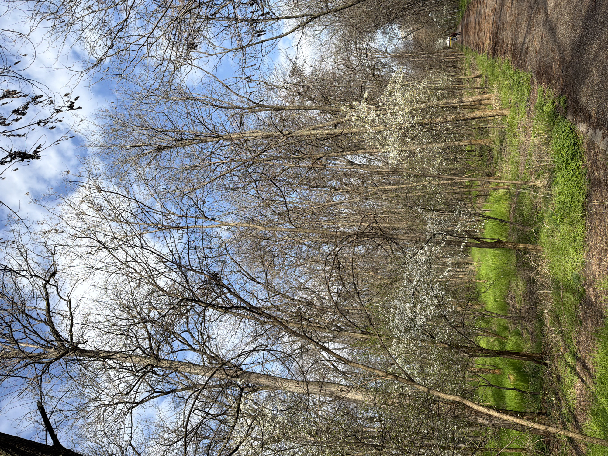 The image displays a wooded park environment in Plovdiv, Bulgaria, during early spring conditions. The scene is dominated by numerous tall, deciduous trees with mostly bare branches, reaching towards a partly cloudy blue sky with scattered white cumulus clouds. In the foreground and midground, smaller trees and shrubs are visible, several of which are covered in clusters of small white blossoms, indicating the early stages of spring bloom. The ground is characterized by patches of bright green grass interspersed with areas of exposed brown earth and dry vegetation. Sunlight illuminates the scene from the right, casting elongated shadows towards the left side of the frame. A wide, unpaved dirt or gravel path runs along the right side of the image, extending into the distant background. Two human figures, indistinct due to distance, are observed walking away from the viewer along this path. Several white, vertically-mounted streetlights are spaced along the right edge of the path further into the background. The overall impression is that of a well-maintained public park or nature trail.