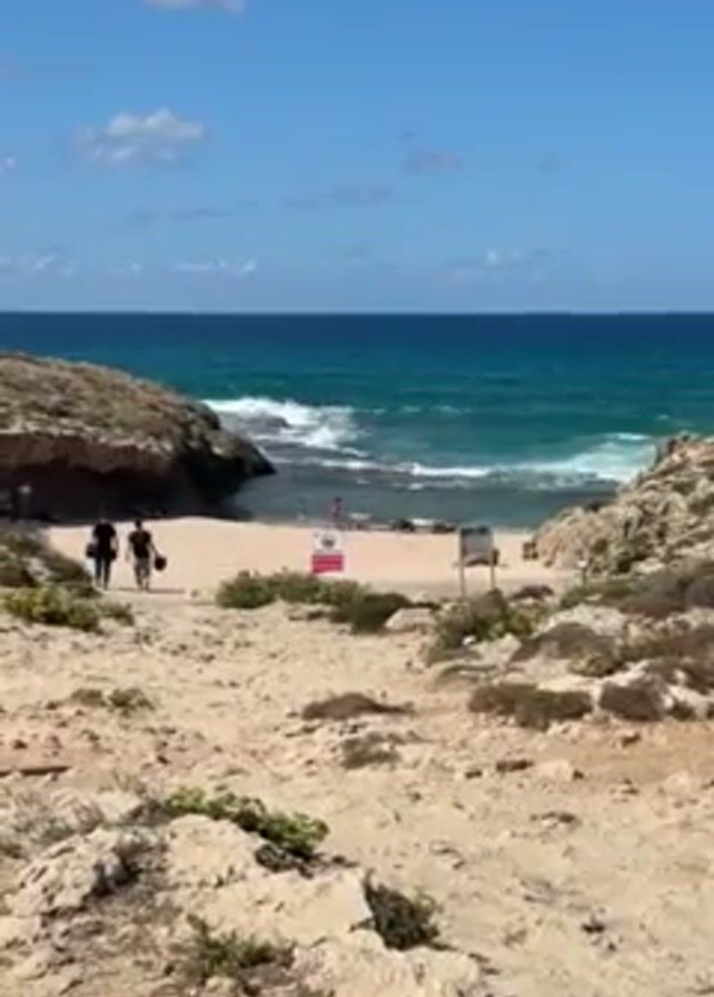 small beach framed by rocky cliffs on a sunny day with a clear blue sky and ocean. Two people are walking down a path towards the beach. There are some signs on the beach and a few people can be seen on the sand near the water. The waves are moderate. The path down to the beach is sandy and rocky, surrounded by low-lying vegetation.