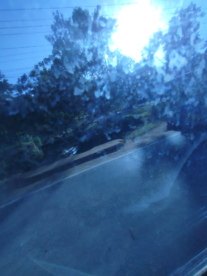A blurred view from a car window depicts a sunlit roadside. Trees line the road, appearing indistinct due to water droplets on the glass. A stream or ditch runs alongside the asphalt. Power lines stretch across the bright sky above the trees. The scene suggests a wet, possibly rainy, environment. The overall image presents a hazy, distorted landscape through a rain-spattered window.