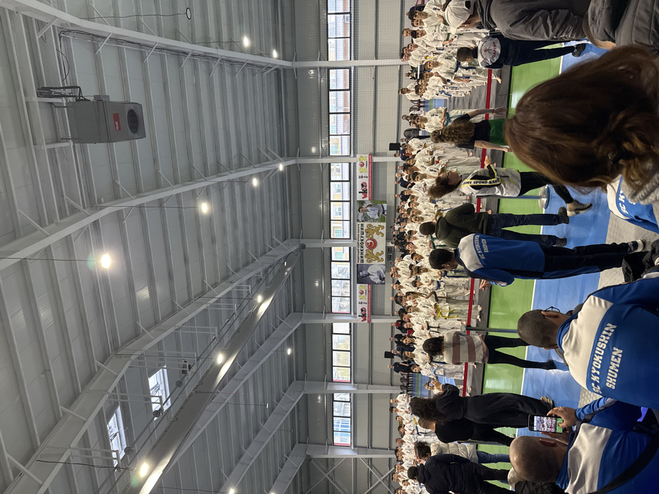 The image depicts an indoor martial arts event in a sports hall located in Nesebar, Bulgaria