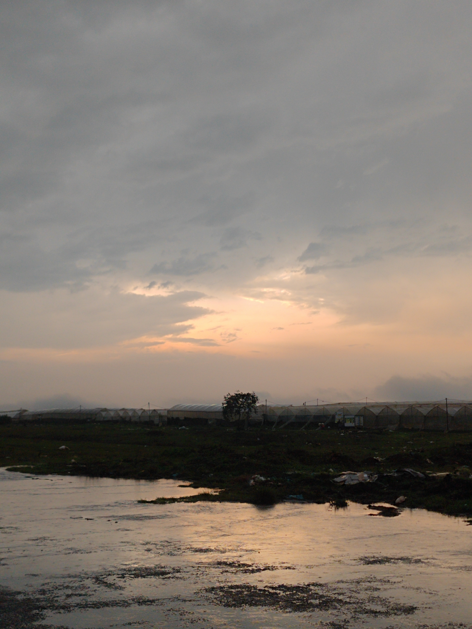 The image captures a murky, flooded landscape in what appears to be a rural area near Cam Ly - Da Lat, Vietnam. In the foreground, a shallow body of water reflects the ambient light from a cloudy sky. The water's surface is covered in debris and some vegetation. Beyond the water, a grassy area with scattered trash slopes upward. In the midground, a sparse tree stands against a backdrop of greenhouses stretching along the horizon. In the distance, the sky is overcast, with a faint glow near the horizon suggesting either sunrise or sunset. The overall atmosphere is somber and potentially polluted.