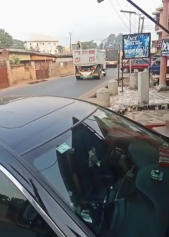 street scene, apparently shot from inside a car. In the background, trucks are driving down the road. A sign for “bet9ja MEGA SHOP” is visible. The camera shifts to a person standing outside a building painted red and white. The person is wearing a yellow patterned shirt, dark shorts, a light-colored hat, and dark sandals. They are looking at a cell phone. The camera pans back to the street showing more vehicles. A car horn is heard.