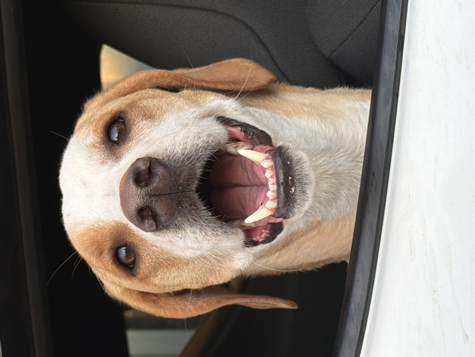 - "A domestic dog, exhibiting a tan and white bi-color coat pattern, is depicted with its head and upper chest extended through a lowered vehicle window" by FM-mkWXI3, licensed under CC BY 4.0