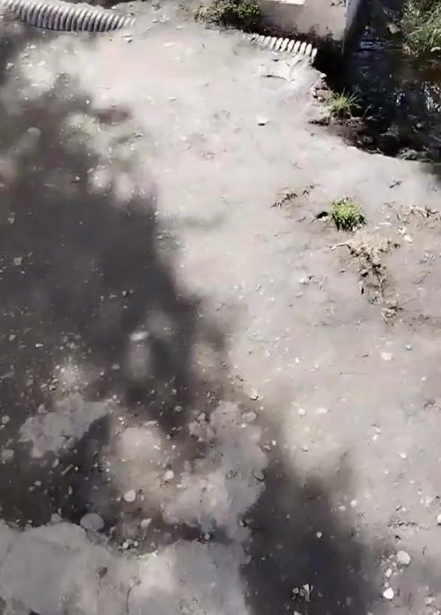 The camera pans over a patch of wet dirt, small rocks, and the shadow of a tree, before focusing on a narrow, shallow stream. The stream flows from under a concrete culvert with a grate. Grass grows along the edges of the stream and a small tree trunk is also visible in the background. The water in the stream is clear enough to see the dark stones at the bottom.