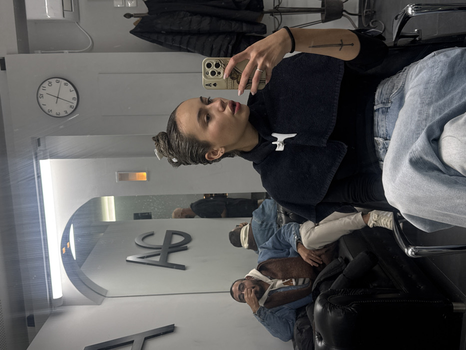 A young woman is depicted from the waist up, seated in a hair salon located in Rehovot, Israel. She is the central figure, facing slightly right and looking into the mirror, holding a light-colored smartphone with a playing card-themed case to capture her reflection. Her hair is dark, partially tied up with two white clips, and coated in a dark, wet substance consistent with a hair treatment or dye. She wears a black smock secured with a white clip over a black long-sleeved top and light-wash blue jeans. A distinct black tattoo of a sword is visible on her left forearm. Her fingernails are painted light pink. In the background, visible through the reflection in a large mirror, a man with a beard and eyeglasses sits on a black leather couch. He wears a denim jacket over a light-colored hoodie and light pants, with his right hand near his mouth. Further in the reflection, an older, bald man wearing a dark shirt is partially visible standing. The salon's interior features light gray walls, a large mirror with an arched top, and prominent dark lettering displaying "AG" on the wall, likely representing the salon's name. An analog clock on the wall shows the time to be approximately 12:45. Fluorescent lighting fixtures are mounted above the mirror, and an air conditioning unit is visible on the upper right wall. A coat rack with dark jackets hangs to the far right.