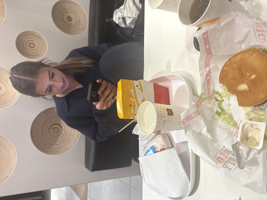 The scene depicts the interior of a McDonald's restaurant in Erstein, France. In the middle ground, a female individual is seated on a black upholstered bench, wearing a dark blue collared sweater. Her dark hair is pulled back, and she is intently focused on a black smartphone held in both hands. Her gaze is directed downwards at the phone's screen. Behind her on the bench, a dark bag or piece of clothing is visible. The wall behind the bench is light-colored and adorned with several decorative, circular wooden or bamboo panels arranged irregularly. The foreground features a white table laden with fast-food items. On a white plastic tray, a McDonald's yellow and red fry box, a McDonald's branded cup containing a clear liquid with ice and a straw, and a wrapped food item covered by a white napkin are arranged. Directly on the table, a partially consumed burger, with a bite taken out and visible lettuce, rests on its branded wrapper, alongside a small, open container of dipping sauce. A second McDonald's branded cup, containing a dark beverage, is partially visible on the far right side of the table. The lighting is artificial and consistent with an indoor commercial establishment.