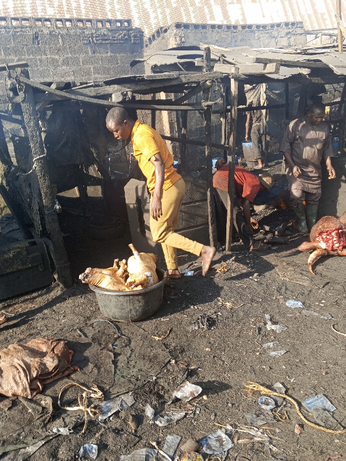 The scene depicts an outdoor meat processing area within Fagge D2, Nigeria