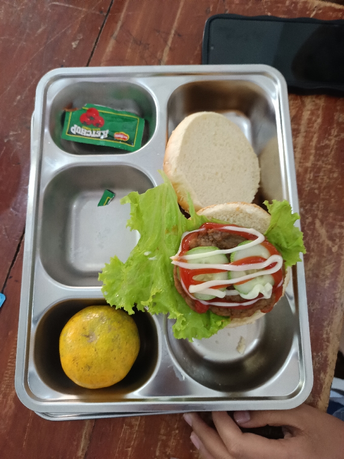 A stainless steel compartmentalized tray is observed on a dark brown wooden surface in Gunung Putri, Indonesia. The tray holds various food items. In the top left compartment, a green packet of "Del Monte Ketchup" is present. To its right, the top bun of a hamburger rests in an empty compartment. Below the ketchup packet, a partially crumpled small green wrapper lies in an empty compartment. In the lower left compartment, a whole, unpeeled yellowish-orange orange is situated. The central right compartment displays the lower portion of a hamburger, consisting of a bun, a meat patty, fresh green leaf lettuce, several slices of cucumber, and zig-zag applications of red (ketchup) and white (mayonnaise) sauces. A person's hand is visible in the lower right corner, resting on the wooden surface next to the tray. A black smartphone is partially visible in the upper right corner of the wooden surface.