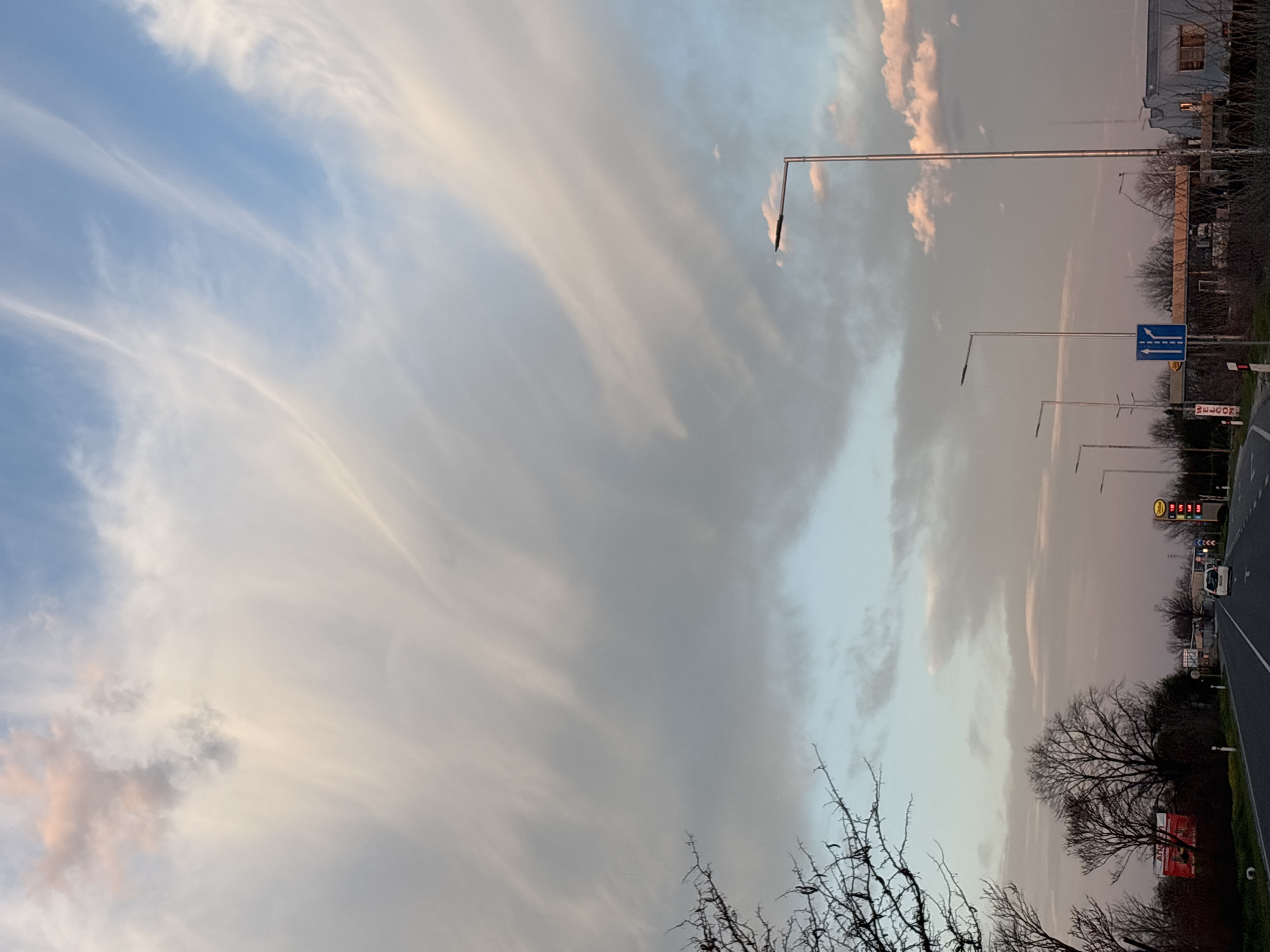 The image depicts a street scene in Plovdiv, Bulgaria, under a cloudy sky. On the right side of the image, a road runs into the distance, flanked by trees and utility poles. A gas station with a yellow sign and red price display is visible further down the road, along with traffic lights showing red. Various road signs are positioned alongside the road. Bare trees are visible in the foreground. The sky occupies a large portion of the image, featuring cirrus clouds tinged with pastel colors, suggesting either sunrise or sunset.