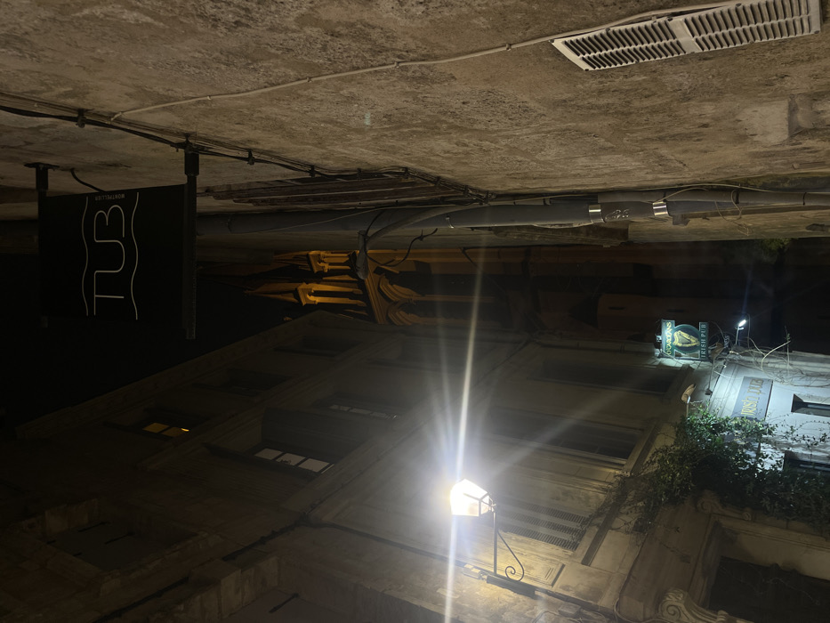 An upside-down perspective shows a street at night. Buildings with lit windows and visible architectural details are illuminated by a streetlamp. Signs indicate "TUB Montpellier" and "O'Sullivans Irish Pub." Exposed pipes and wires run along a concrete ceiling above. A metal ventilation grate is visible at the top. The image conveys an urban nighttime scene.