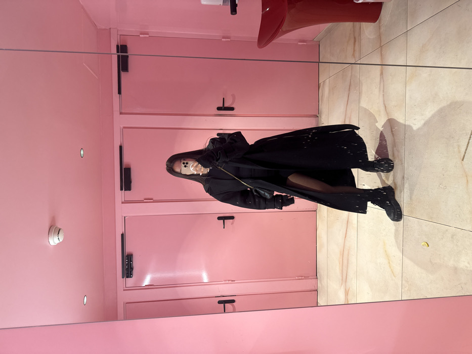 A woman in a long black coat, black dress, and black boots stands in front of a mirror. She holds a phone, presumably taking a photo. The room has pink walls and doors with black handles. A red toilet is visible in the upper part of the frame. The floor appears to be marbled in light neutral tones.