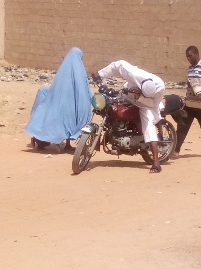 The image captures three individuals and a red motorcycle on a dry, light brown dirt ground in Rangaza, Nigeria
