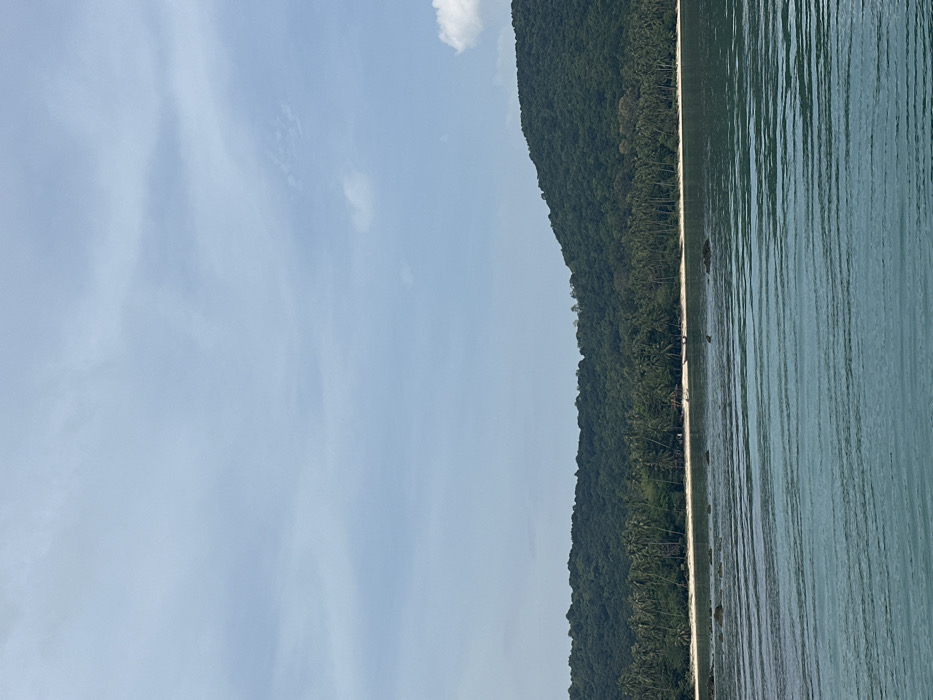 A landscape photograph displays a shoreline where the sea meets a lush, tree-covered mountain. The water, occupying the right side, is calm with light reflections. A thin sandy beach separates the sea from the dense green foliage. A bright sky with scattered clouds fills the left side. The scene is bathed in daylight, creating a serene and tropical ambiance.