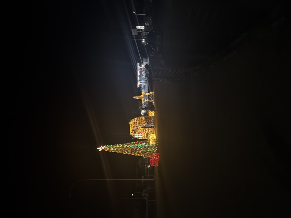 A dark, nighttime scene reveals festive holiday decorations. A lighted Christmas tree with a star on top stands out, along with illuminated gift box shapes at its base. Behind the tree, a glowing circular form adds to the display, while a large star decoration is visible further back. Streetlights are partially visible.