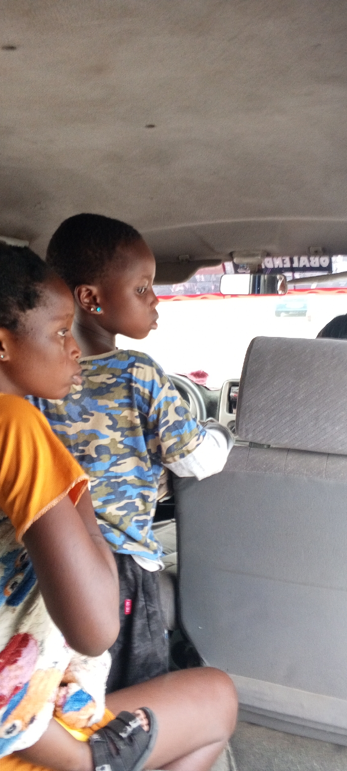 Inside a vehicle, two children sit in a back seat. The child on the left wears a yellow shirt and a colorful blanket rests on their lap. To their right, another child wears a camouflage shirt, dark shorts, and a blue earring. Both children gaze towards the right. The vehicle's interior shows grey seats and a dirty ceiling. A rear-view mirror hangs above them.