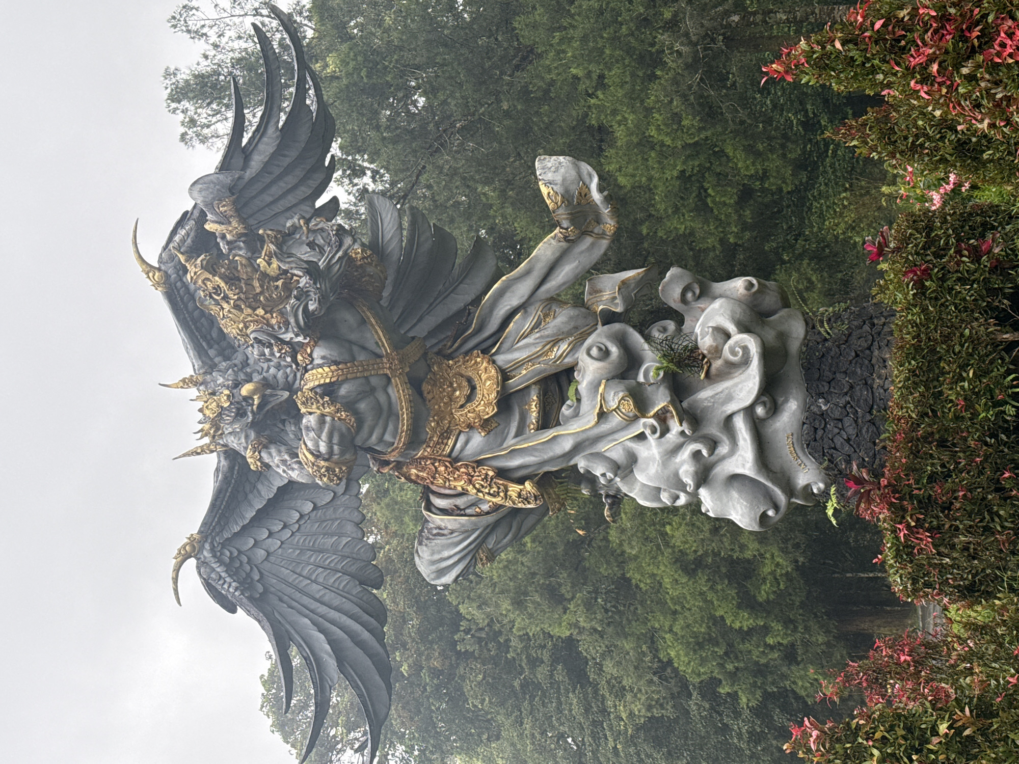 A vertical photograph shows a stone statue of Garuda Wisnu Kencana in Bedugul, Indonesia. The statue is depicted from its left side, facing slightly left. The statue has the head of a mythical bird-like figure with horns and a gold adornment. The body is gray, with gold ornamentation around the chest and waist. The wings are gray, and in a flying position. The lower half of the statue features the Garuda perched on a stone pedestal that includes swirling patterns. The statue is set against a background of lush greenery, with trees behind and to the left, and a bush with red-tinged leaves to the right. The sky overhead is overcast.