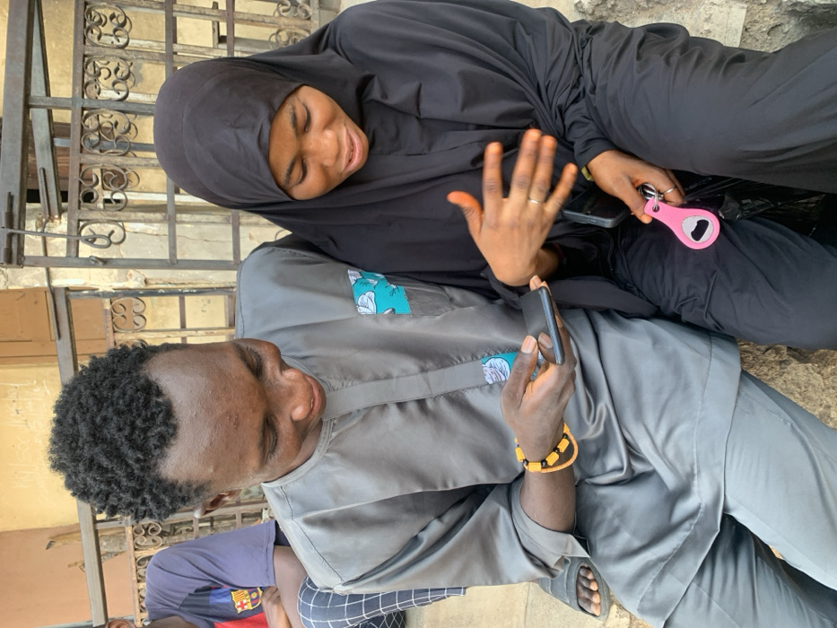 The image depicts three individuals seated outdoors in Okene, Nigeria. In the foreground, a young adult male, with short black curly hair and dark skin, is positioned on the left, looking down at a black smartphone held in his left hand. He wears a grey satin-like tunic with a patterned blue-and-white fabric detail on the chest pocket and sleeves, grey trousers, and black sandals. An orange and black beaded bracelet is visible on his left wrist. To his right, a young adult female, also with dark skin, is seated. She wears a black hijab covering her head and shoulders, and a black long-sleeved garment. Her right hand, stained with a reddish-brown substance consistent with henna, is raised and gesturing, revealing a plain ring on her right ring finger. She holds a black smartphone in her left hand, along with a set of keys and a pink bottle opener. Both subjects appear to be focused downwards, possibly at the male's phone, with the male smiling slightly and the female's mouth partially open. A third individual, a young male, is partially visible to the far left, wearing a dark t-shirt with a club crest (likely Barcelona) and checkered trousers, seated next to the primary male subject. All three are seated on a light-colored, rough concrete or stone surface. The background features a weathered, light brown building facade with visible cracking and discoloration, behind which a dark, ornate metal railing or gate is present.