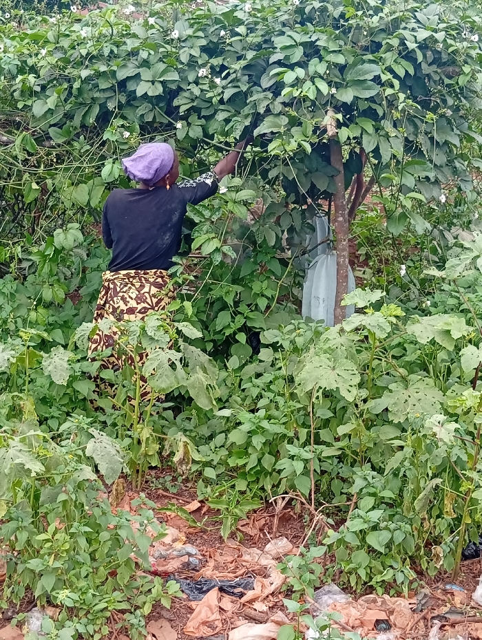 An adult individual, observed from the rear, is positioned within a dense plot of green vegetation in Ejule, Nigeria. The person wears a purple headwrap, a dark long-sleeved shirt exhibiting a faint light pattern on the upper arm, and a patterned skirt in brown and yellow tones. Their right arm is extended into a large, vine-like plant characterized by numerous green leaves and small white flowers, indicative of a harvesting or tending action. The ground consists of reddish-brown soil intermingled with dried plant matter and scattered refuse, including crumpled brown paper and black plastic bags. A slender tree trunk supports the dense foliage on the right, from which a light-colored plastic bag hangs partially obscured.