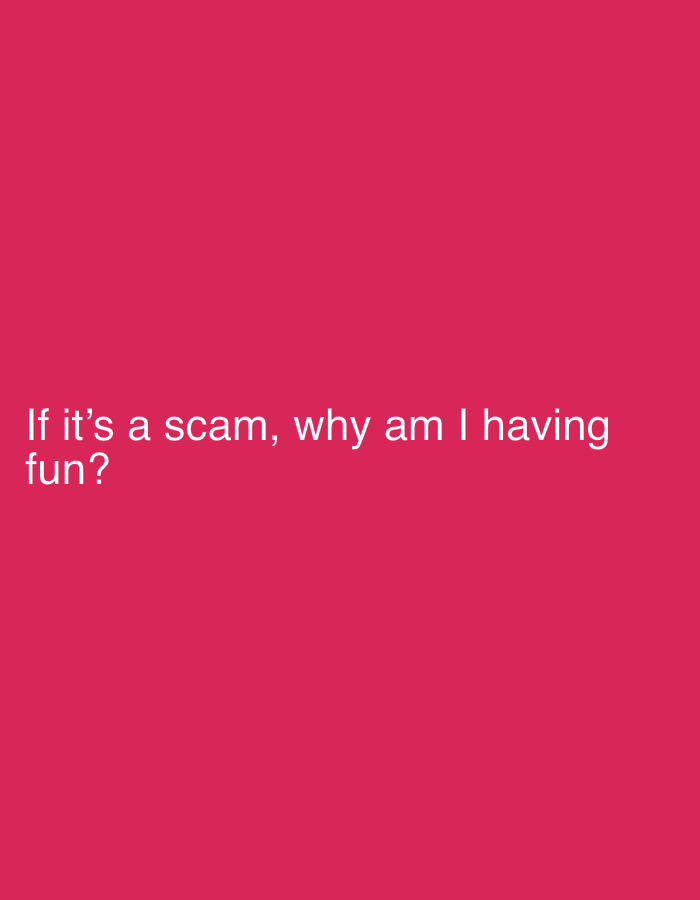 The image displays a solid deep pink background. In the lower left corner, a white sans-serif font spells out a rhetorical question: "If it's a scam, why am I having fun?" The text is legible and contrasts strongly with the background, making it easily readable. The message itself suggests a potentially risky or dubious situation that is paradoxically enjoyable.