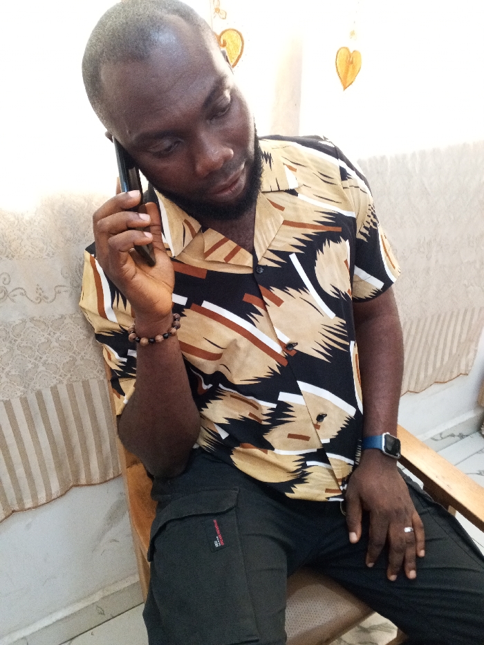 A dark-skinned adult male, bald with a beard, is depicted seated indoors, angled slightly to his right. He holds a black smartphone to his right ear with his right hand, engaged in a phone call, and looks downwards. He wears a short-sleeved, collared button-up shirt featuring an abstract pattern of black, tan, white, and brown shapes. Dark olive-green cargo pants with a pocket flap and a small red and white label on the left thigh are visible. A multi-strand brown beaded bracelet is on his right wrist, and a blue-banded smartwatch with a silver-colored casing is on his left wrist. A plain silver-toned ring is present on his left ring finger. The subject is seated on a light brown wooden chair, partially visible on the right side of the frame. The background consists of a light-colored, patterned fabric covering furniture on the left, a plain off-white wall, and two heart-shaped golden-yellow decorative hangings near the top. Light-colored floor tiles are visible at the bottom right. The scene is depicted in Lokoja, Nigeria.