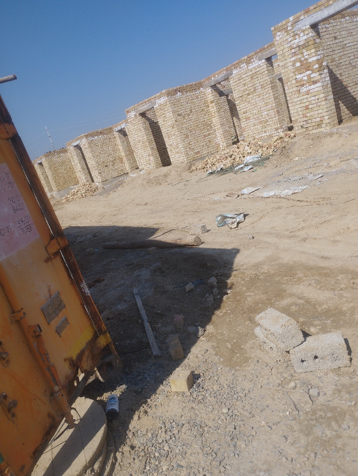 The scene depicts an inactive construction site in Chirchik, Uzbekistan, under a clear blue sky. In the left foreground, the weathered, rusted side of a yellow-orange shipping container is partially visible, supported by a concrete base. An empty white cylindrical object lies on the ground near the container. The ground is dry, uneven, and composed of dirt, gravel, and scattered construction debris, including loose bricks, concrete blocks, and fragments of wood and metal. A prominent row of incomplete structures, characterized by exposed light-colored brick walls without roofs, extends across the midground and background, suggesting buildings under construction or renovation. Piles of construction rubble are visible along the base of these structures. No individuals or active work are present in the frame.